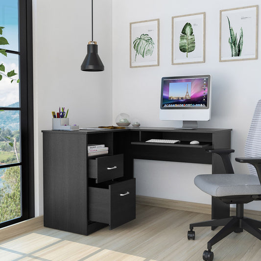 L-Shaped Desk with Keyboard Shelf in Black Wengue Finish