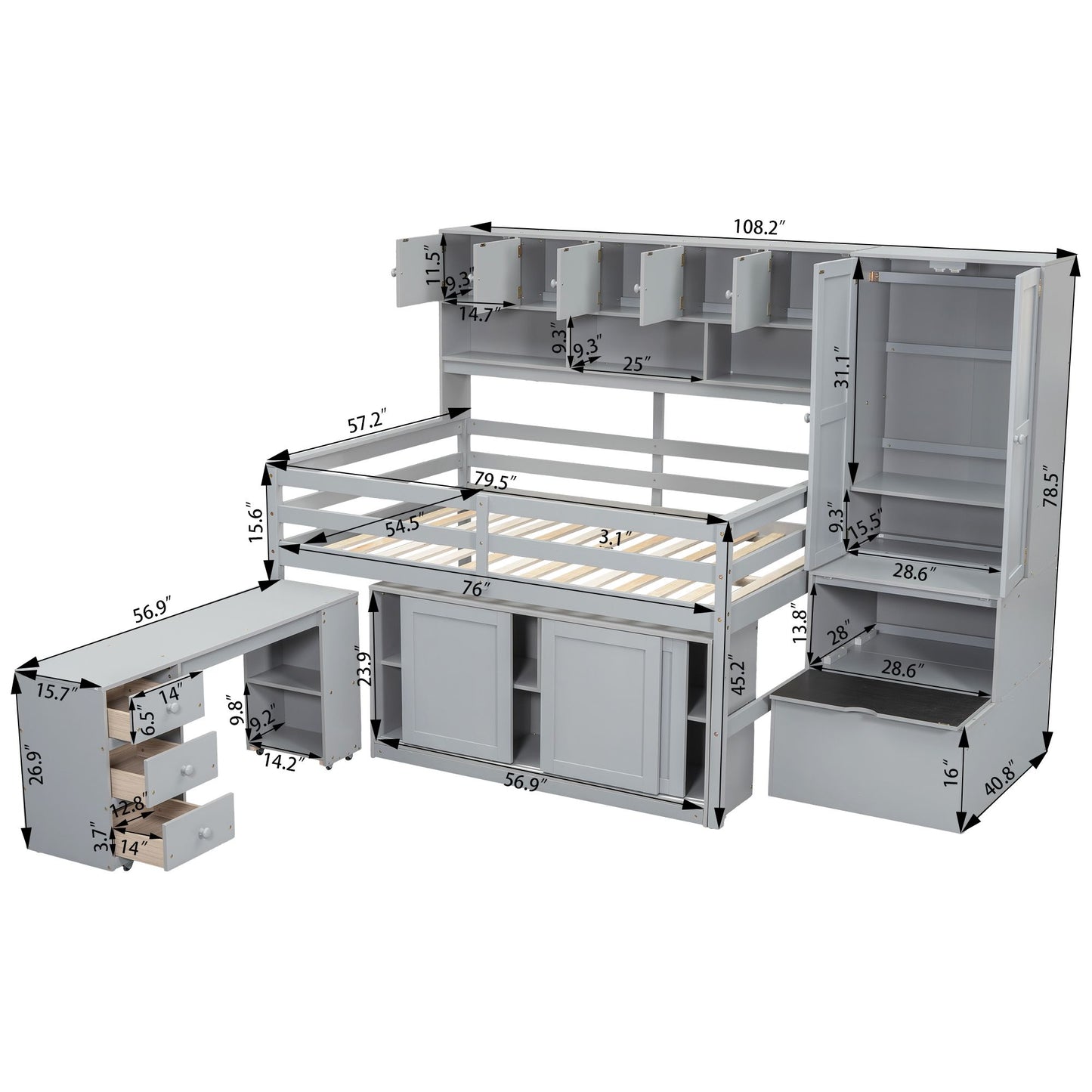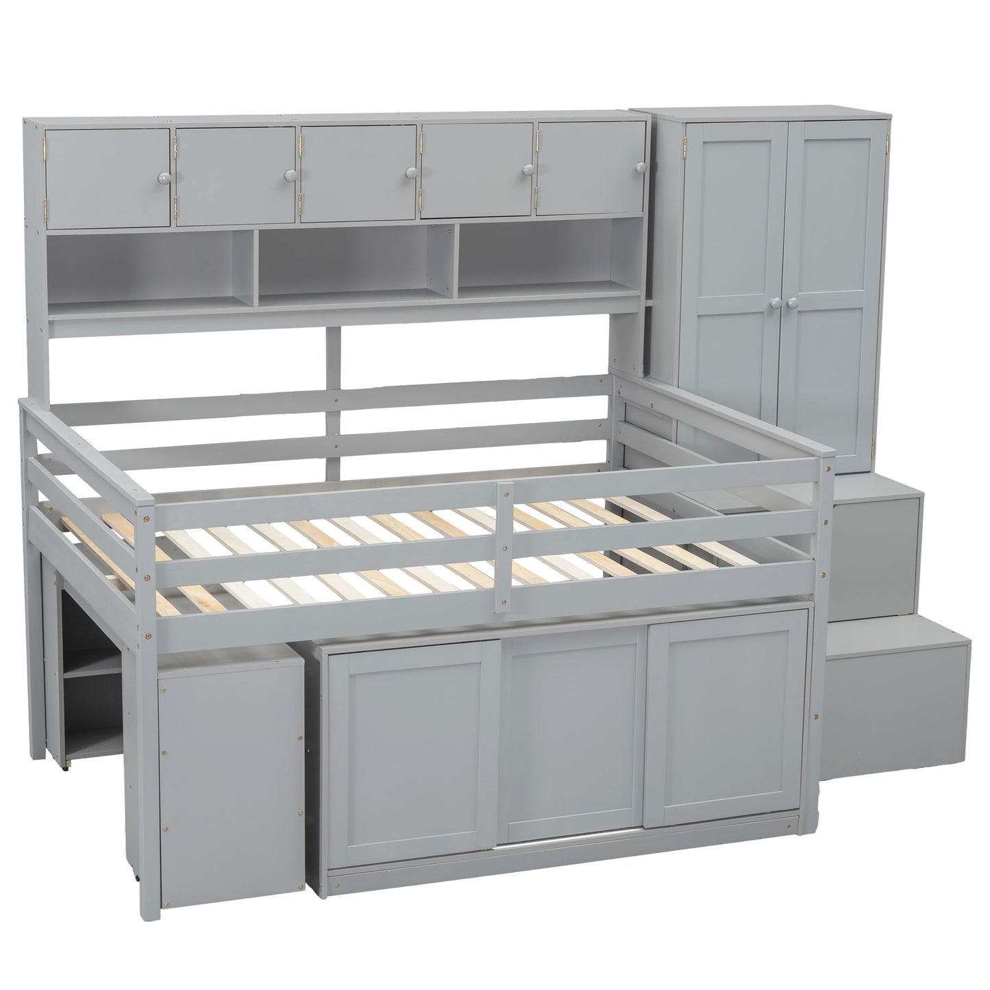 Full Size Loft Bed with Storage, Wardrobe and Rolling Desk