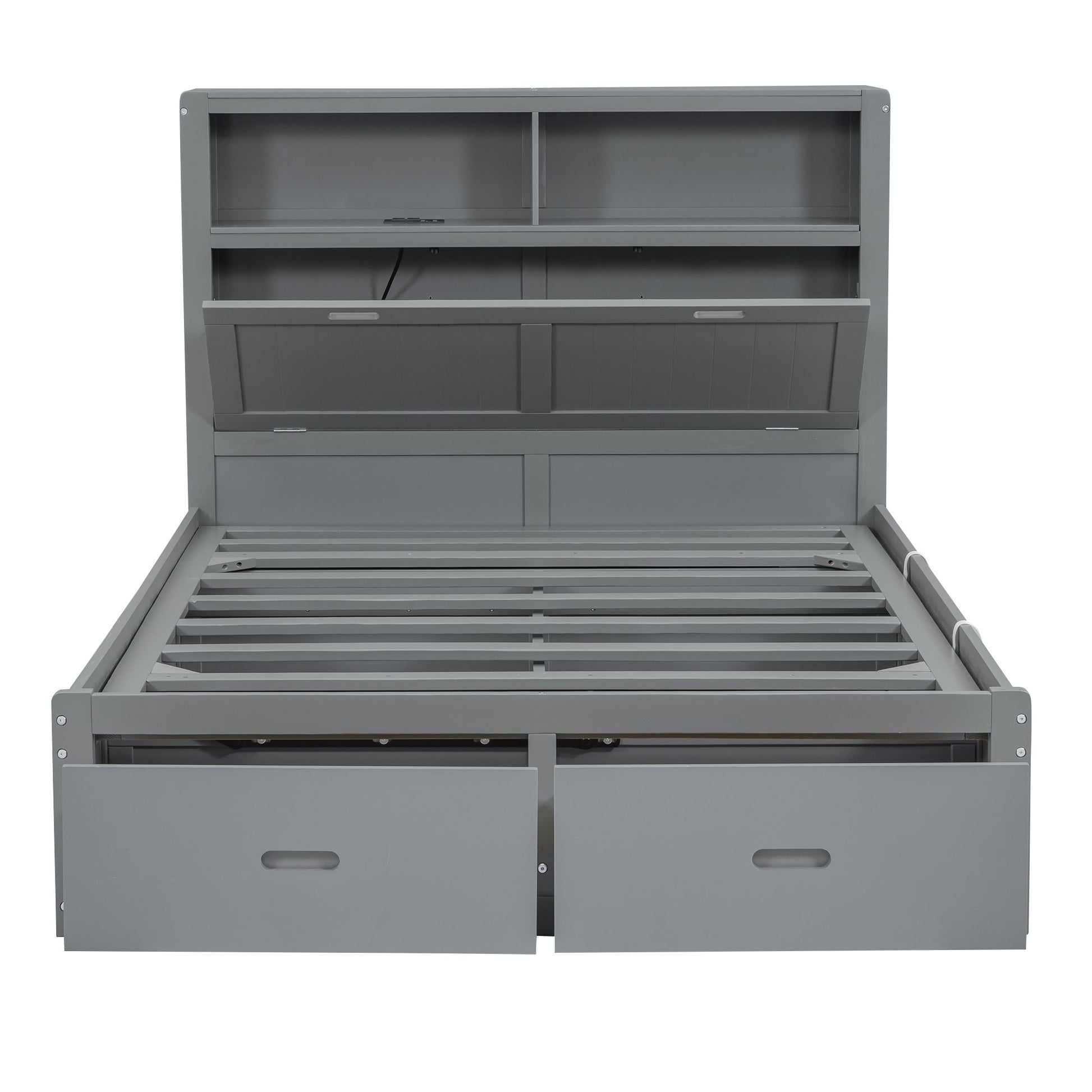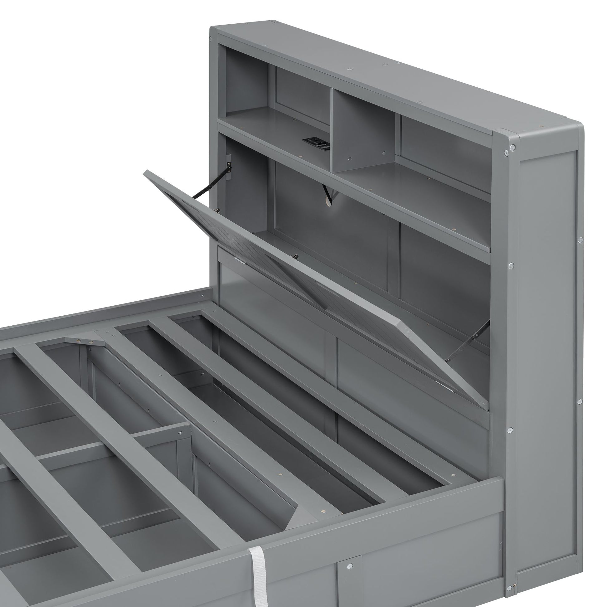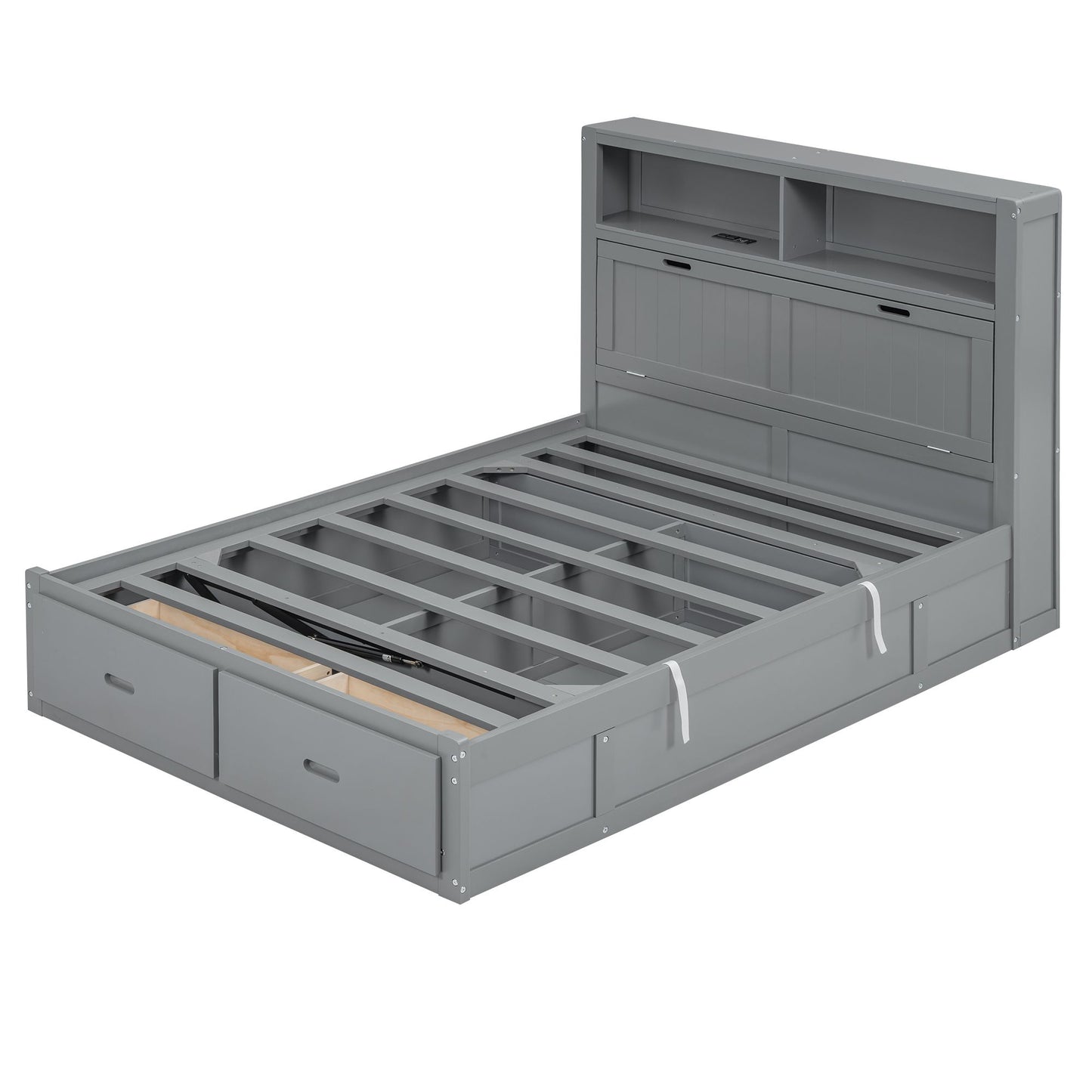 Full Platform Bed with Hydraulic Lift Storage, LED Headboard and Charging Station in Gray