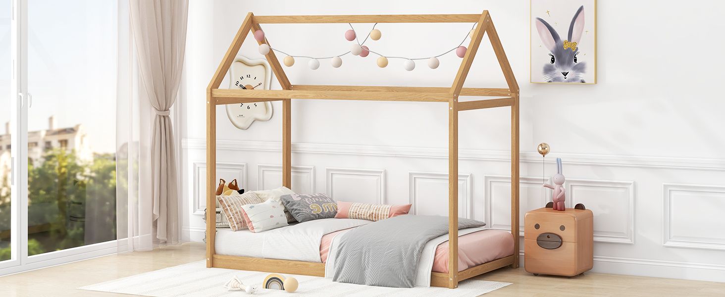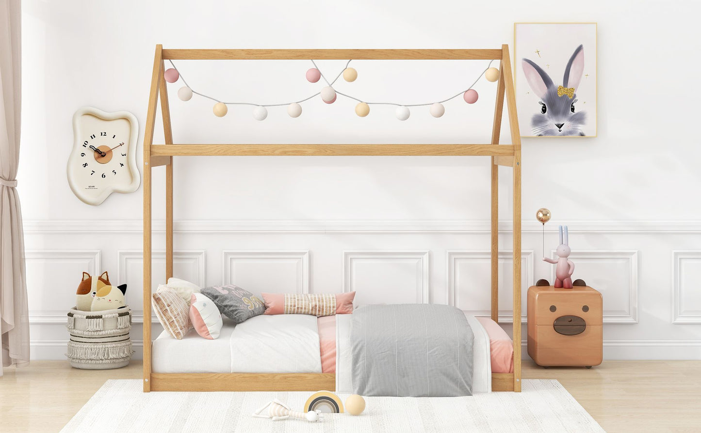 The Perrysville Twin House Bed in Natural adds a touch of charm and character to your child’s room. Its elegant yet straightforward design encourages creativity, offering a customizable space that inspires imagination. The low-profile frame promotes safety and easy access. Made from high-quality pine wood and MDF, this sturdy bed is built to last as your child grows. With pre-drilled holes for effortless assembly and a distinctive house-shaped silhouette, it blends functionality with classic style. The color-matched hardware completes the refined, seamless appearance, making it a timeless piece for any bedroom.