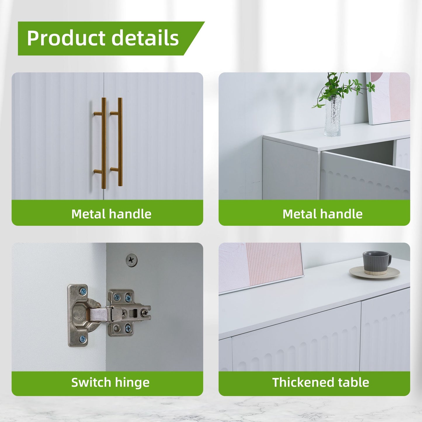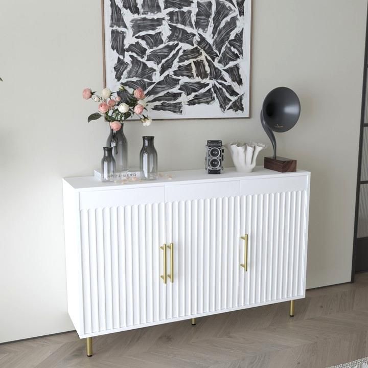 Add both functionality and sophistication to your dining or living room with this elegant fluted 3-door sideboard, accented with slender gold handles. The unique vertical door design exudes a sense of nobility and style, while the clever interior features two cabinets and a shelf for maximum storage space. With its sturdy pine legs providing support, this accent cabinet boasts a modern and elegant appeal, perfect for complementing any home decor. From kitchen to entryway to bedroom, this versatile piece is a must-have for any tasteful and exclusive home.