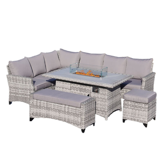 5-Piece Rattan Outdoor Sofa Set with Fire Pit Table and Ottoman