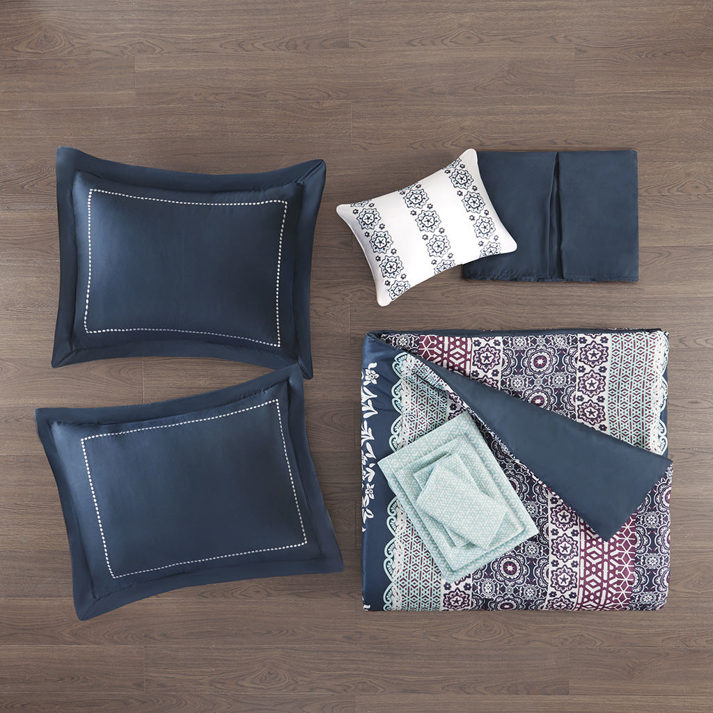 The Intelligent Design Loretta Boho Comforter Set with Bed Sheets brings a bright, casual update to your bedroom. A large medallion print, in navy and purple, runs down the center of the comforter with subtle bohemian details highlighted in white. Coordinating shams (1 in Twin/TwinXL) with embroidered borders complement the comforter. A decorative pillow with ruched and pieced detailing and a solid navy bed skirt finishes the look. Also included is a complete sheet set that reiterates the bohemian motif. This bedding set is also OEKO-TEX certified, meaning it does not contain any harmful substances or chemicals to ensure quality comfort and wellness.