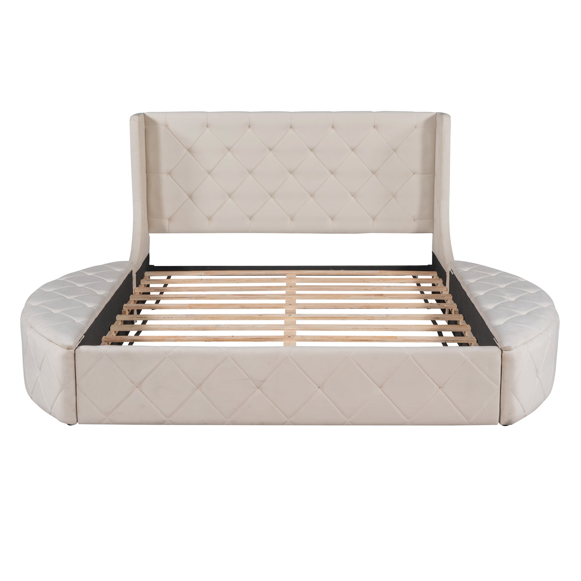 Indulge in the luxury of the Stratton Upholstered Queen Size Platform Bed. Adorned in rich velvet and detailed with a wingback headboard, this opulent bed boasts a spacious storage drawer and two elegant semi-circular stools. Crafted with a sturdy wood frame and a slat system for added stability, this bed exudes both functionality and beauty. Elevate your space with this sophisticated and on-trend design.