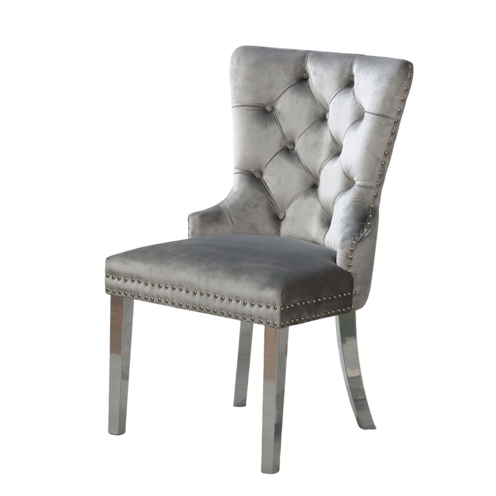Indulge in the opulent charm and magnificence of this exquisite chair. Carefully constructed with plush flannelette fabric that exudes a luxurious velvet-like feel and adorned with intricate button-tufting, this sophisticated side-chair sets a new standard for excellence. The added touch of nailhead accents and a gleaming metal ring handle lends an air of refinement, while the sleek chrome legs emanate a modern and prestigious aura. Ideal for lavish living and unparalleled comfort.