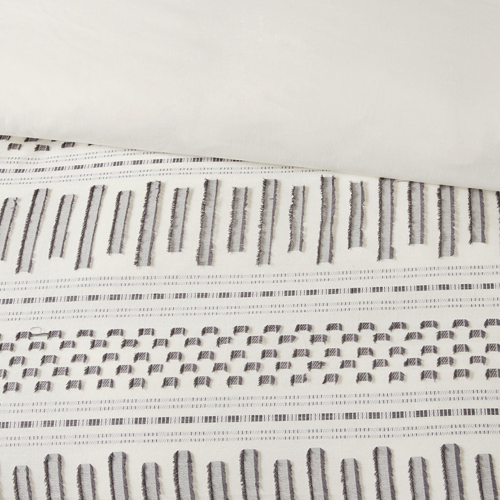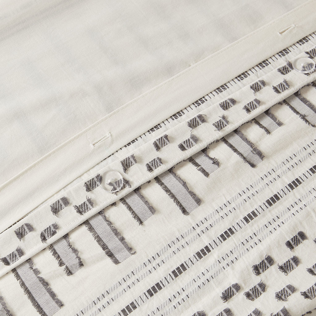 Give your bedroom a comfortable farmhouse look with INK+IVY's Rhea Cotton Jacquard Duvet Cover Mini Set. The ivory cotton duvet cover features horizontal stripes, in charcoal hues, with eyelash-looking woven details that add a charming accent to the top of the bed. Matching shams mimic the design seen on top of the bed completing the cotton jacquard bedding set. Made from 100% cotton, this jacquard duvet cover set is machine washable for easy care and provides a causal allure for your bedroom décor. A button closure allow you to place a comforter insert within the duvet cover and four inside ties on the corners help prevent it from shifting (Insert is NOT included). This bedding set is also OEKO-TEX certified, meaning it does not contain any harmful substances or chemicals, ensuring quality comfort and wellness. Items in the set may come in a rolled or compressed packaging, which will need to be fluffed up or steam ironed before use to remove wrinkles.