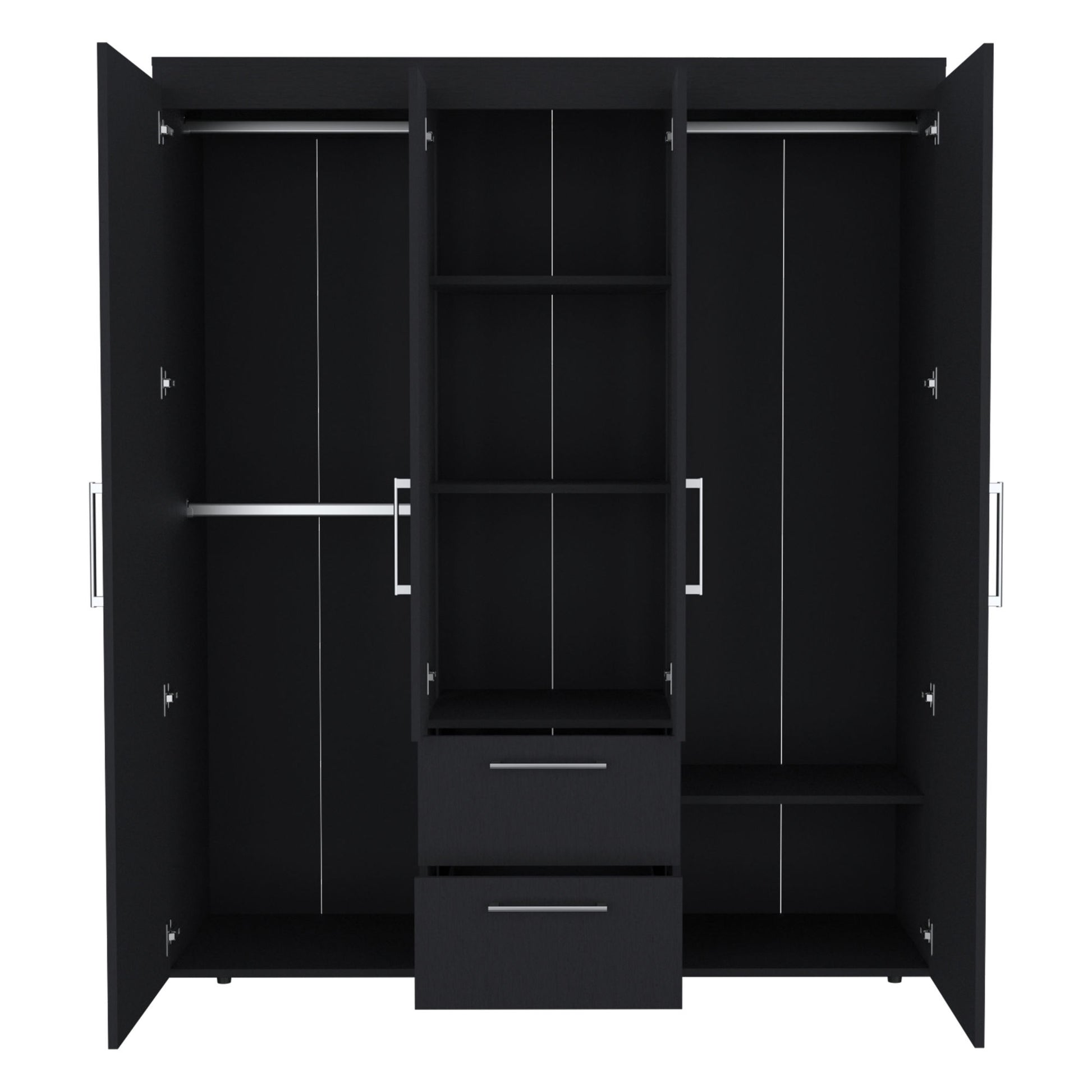 Expansive Dual-Side Storage: Two doors open to large compartments with rods for organized hanging.