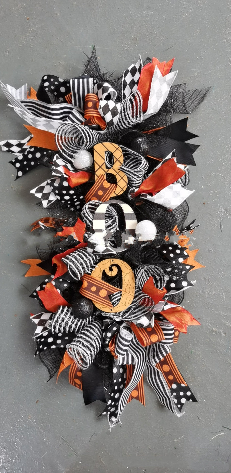 Add a spooky touch to your door with this Halloween "Boo" Motif Door Decor. Crafted from cotton and mixed materials, it measures 50 by 15 by 5 cm and comes in festive black and orange hues. Perfect for welcoming trick-or-treaters with a playful spirit!