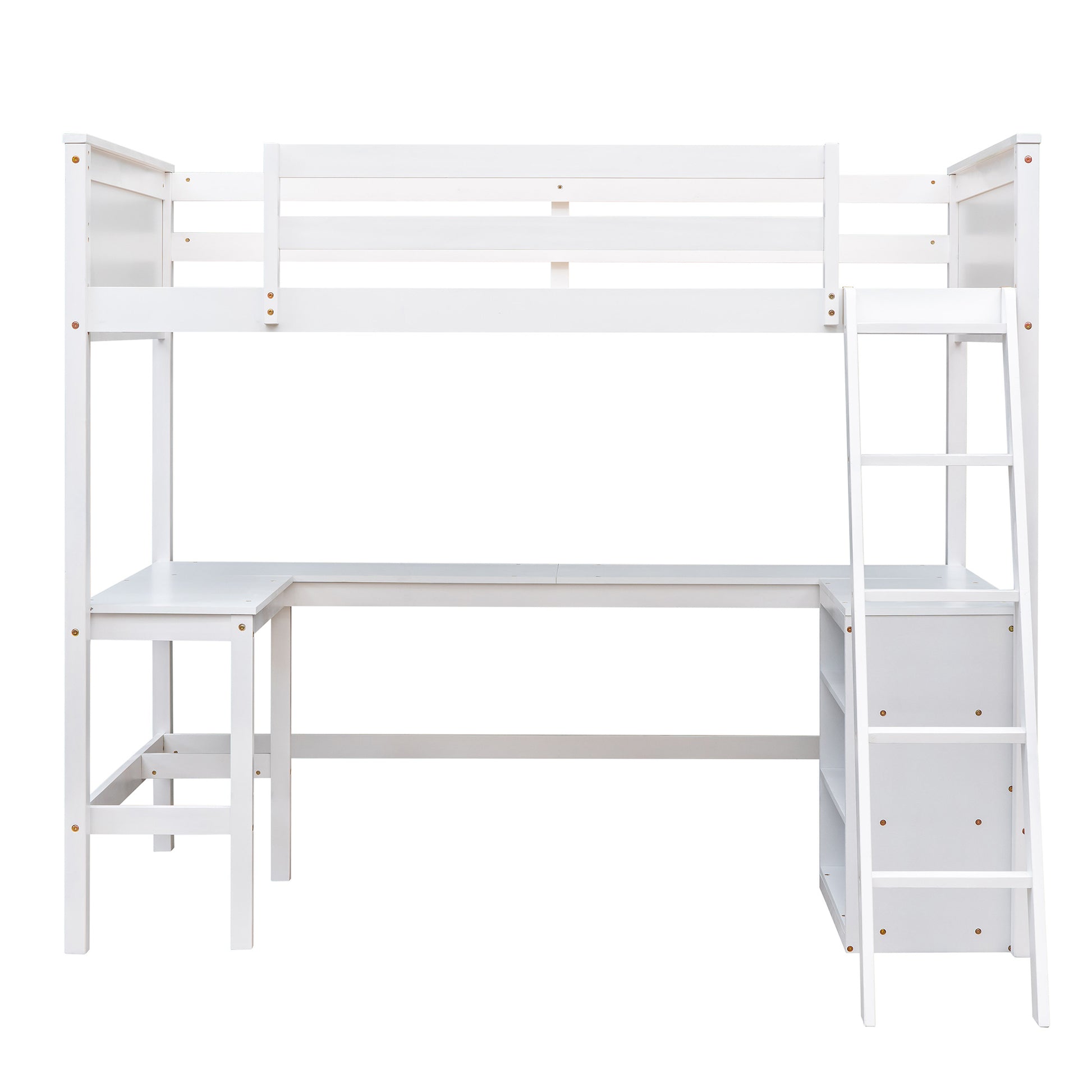 [Solid Construction] This muti-functional loft bed is crafted from a solid pine wood frame, with commercial grade MDF board for quality control and durability. The stable ladder can be assembled on other side of the bed. Guardrails are solidly attached for added safety.