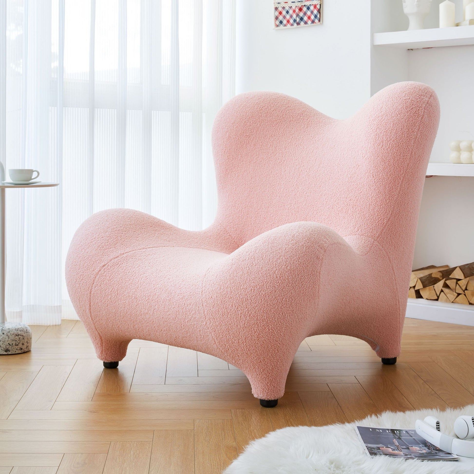 Experience the luxury of our Sherpa fabric upholstery, exquisitely soft to the touch and capable of keeping you warm even in colder weather, creating a snug and inviting atmosphere. The boucle covering not only enhances comfort but also adds a touch of elegance that instantly softens your space.